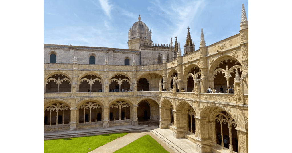 マヌエル様式の繊細な装飾が施された回廊は圧巻で、大航海時代の栄華を今に伝えます。隣接する教会には、ヴァスコ・ダ・ガマの棺 が安置されています。