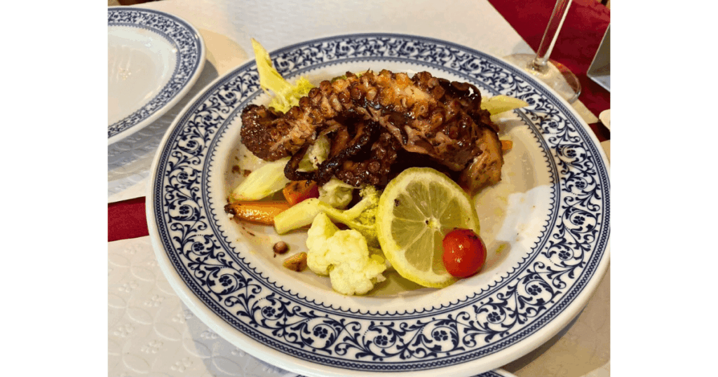 ポルヴォ・ア・ラガレイロ(Polvo à Lagareiro) は、驚くほど大きなタコにもかかわらずとても柔らかく、にんにくとオリーブオイルの風味が絶妙。